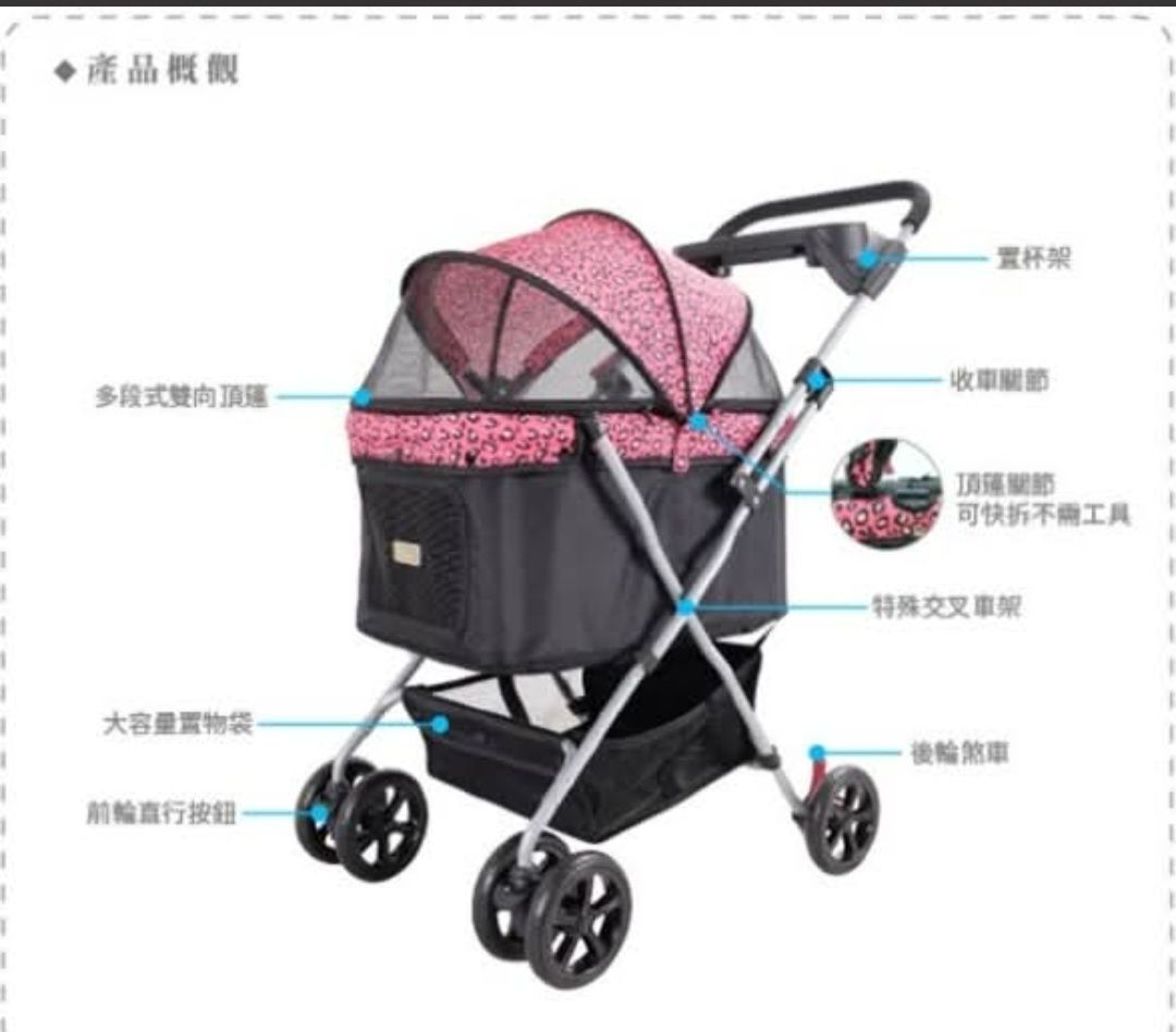 商品內容: 粉色豹紋多功能寵物推車一組 (含置杯架、置物籃、安全扣繩)