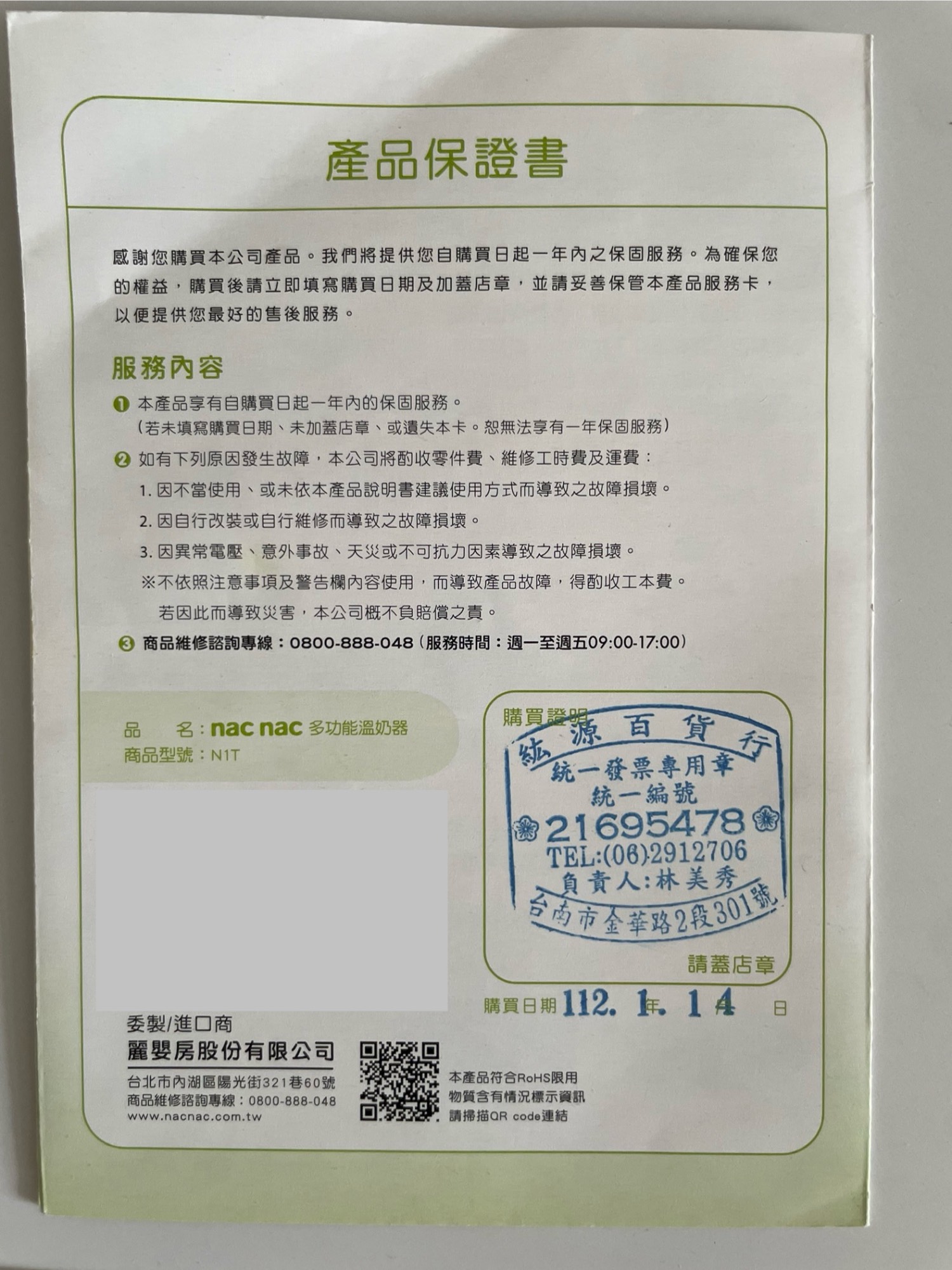 有留原購買保證卡,左下方因有寫上我的私人個資,我會貼膠帶覆蓋,請見諒