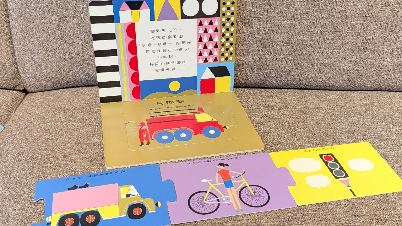 硬頁書結合拼圖,書裡共有六片拼圖,正反兩面都可以使用。引導孩子觀察不同交通工具