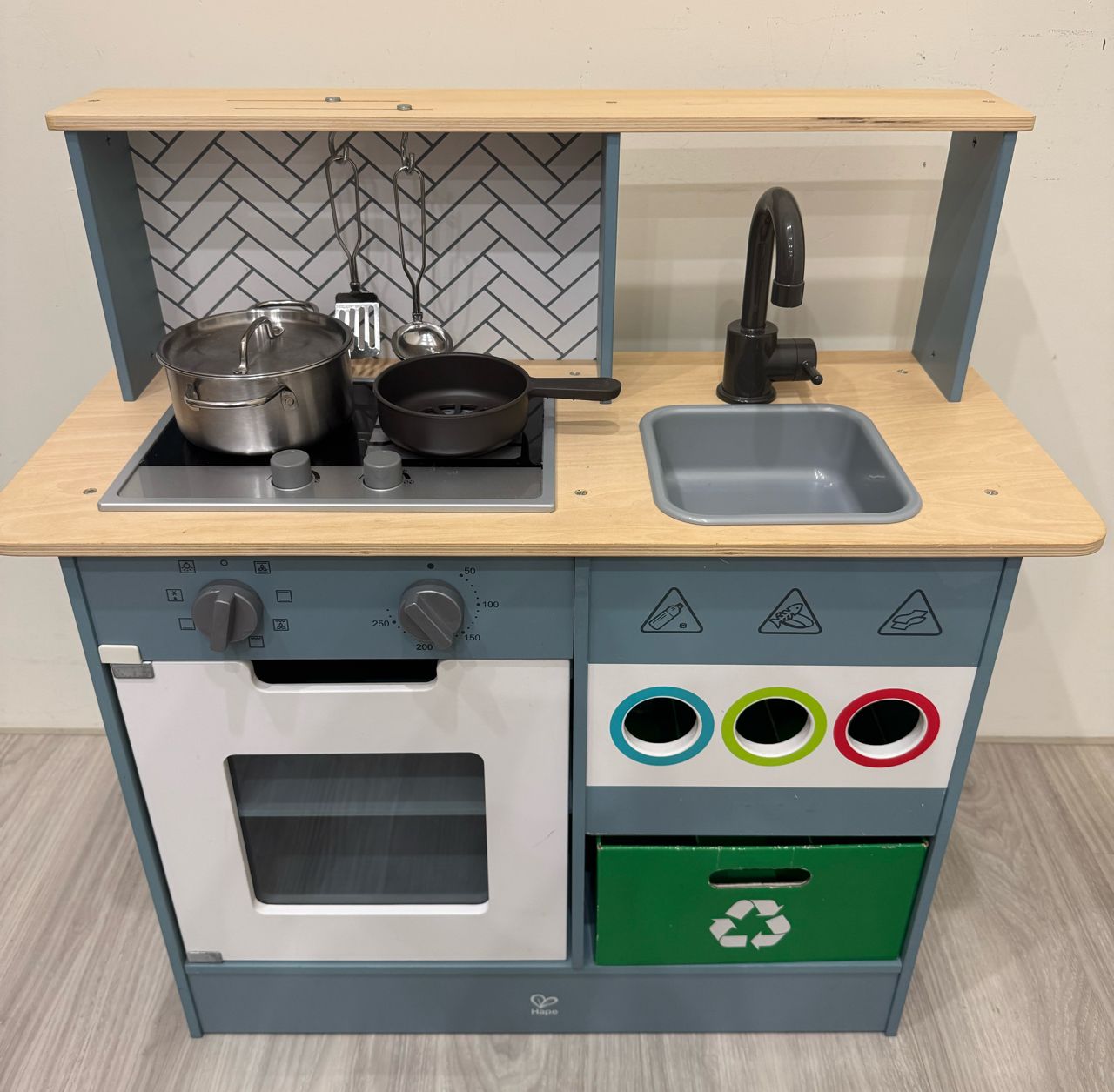 Hape木製廚房保存蠻好的,有一些正常使用痕跡。切切樂皆為木製,全部一起贈送。
