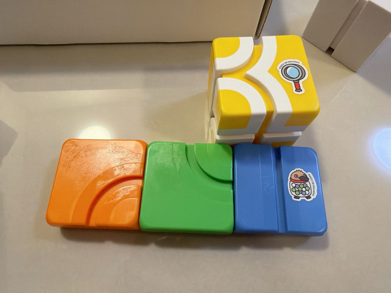橘色和綠色小塊有貼紙殘膠,黃色和藍色有貼紙