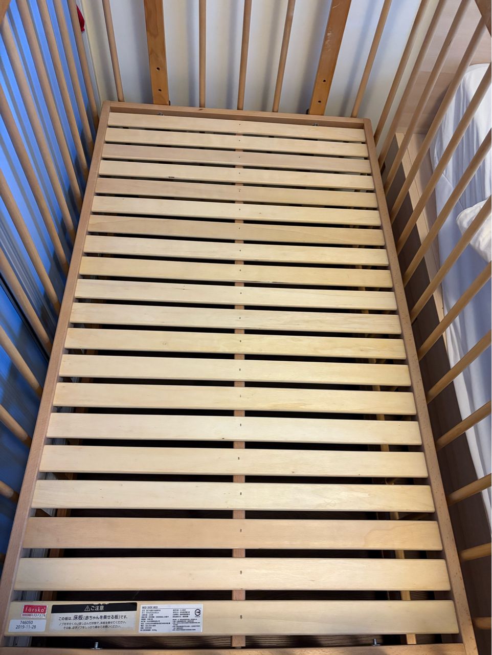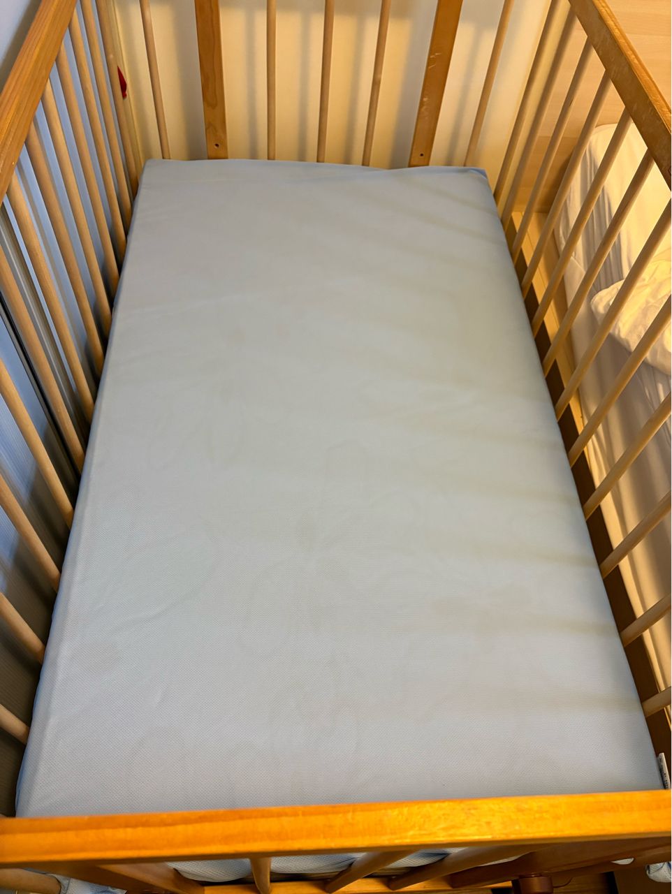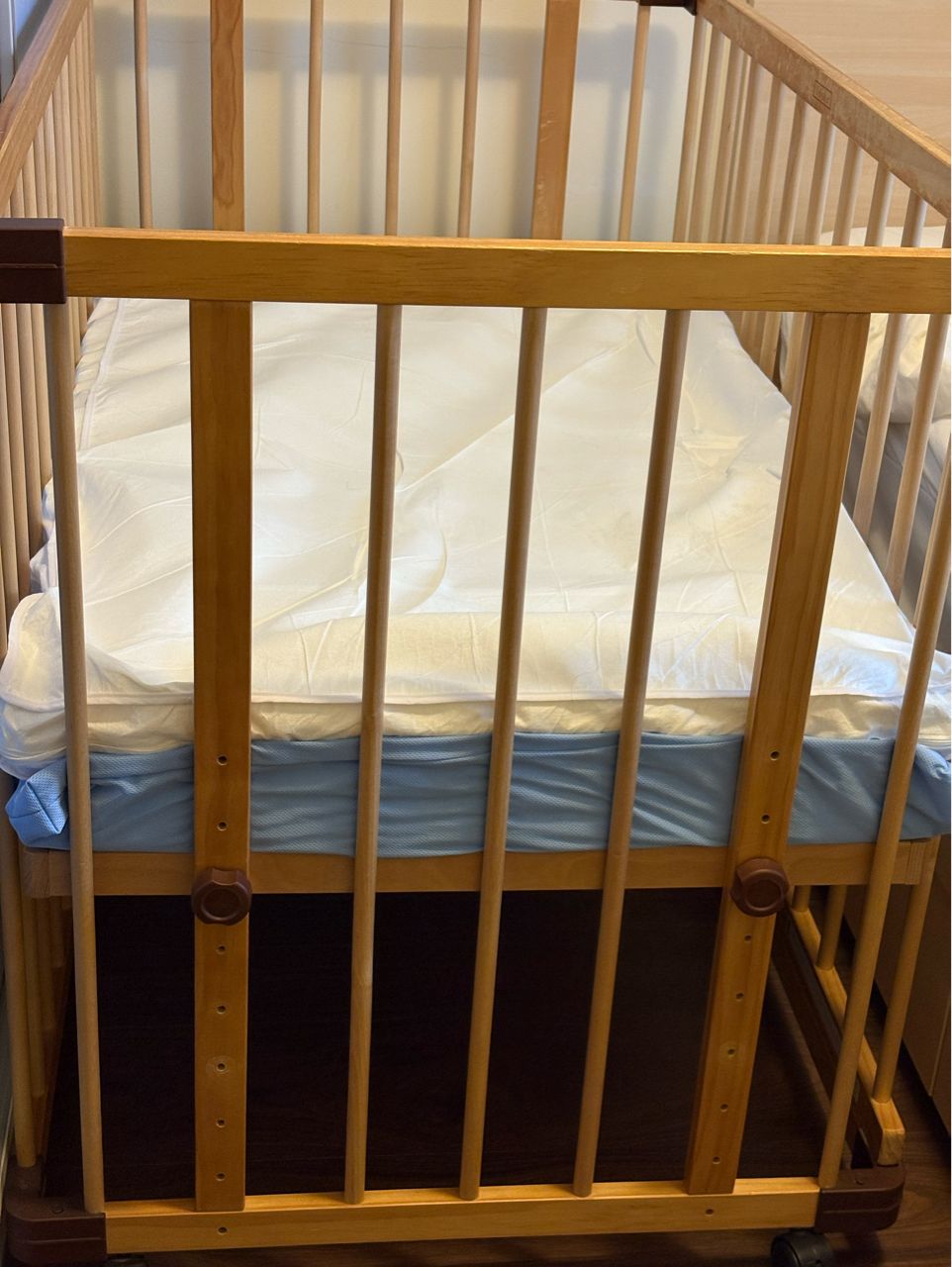 嬰兒床使用了近6年有使用痕跡(主要是長牙期的咬痕),但保存良好,固定吸塵,保護
