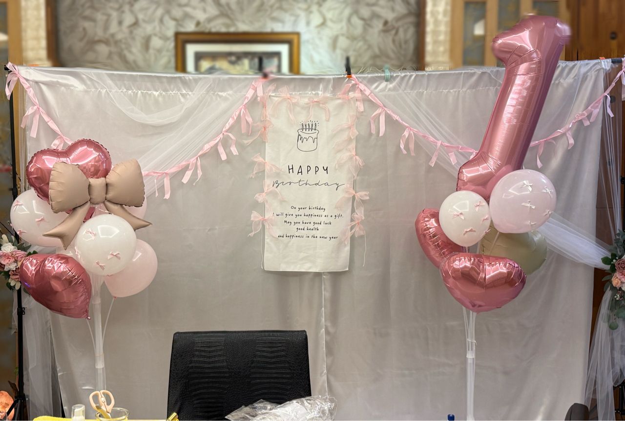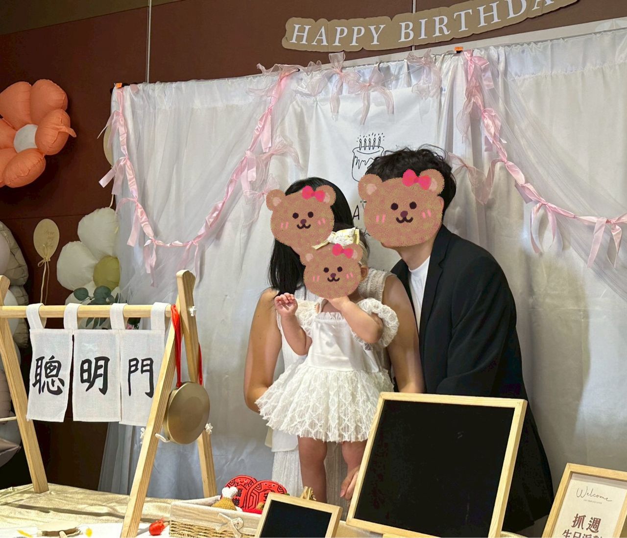 我們周歲宴辦在餐廳,因為喜歡白色系所以自己買以上的用品來佈置,背景支架不會重,