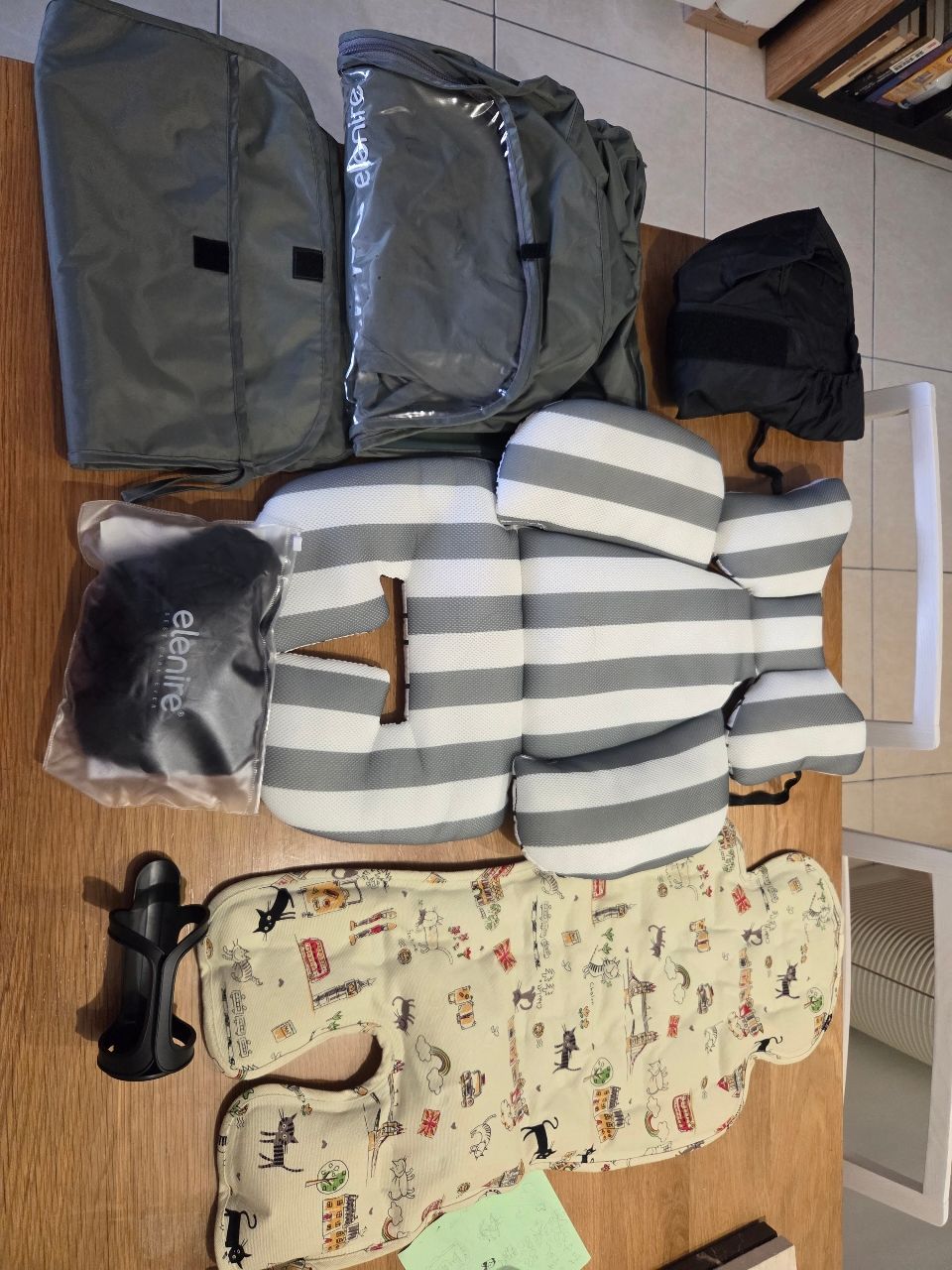 2、配件完整,有雙肩背袋、蚊 帳、風雨罩、杯架和配件收納 袋,以上全新。涼墊、軟墊