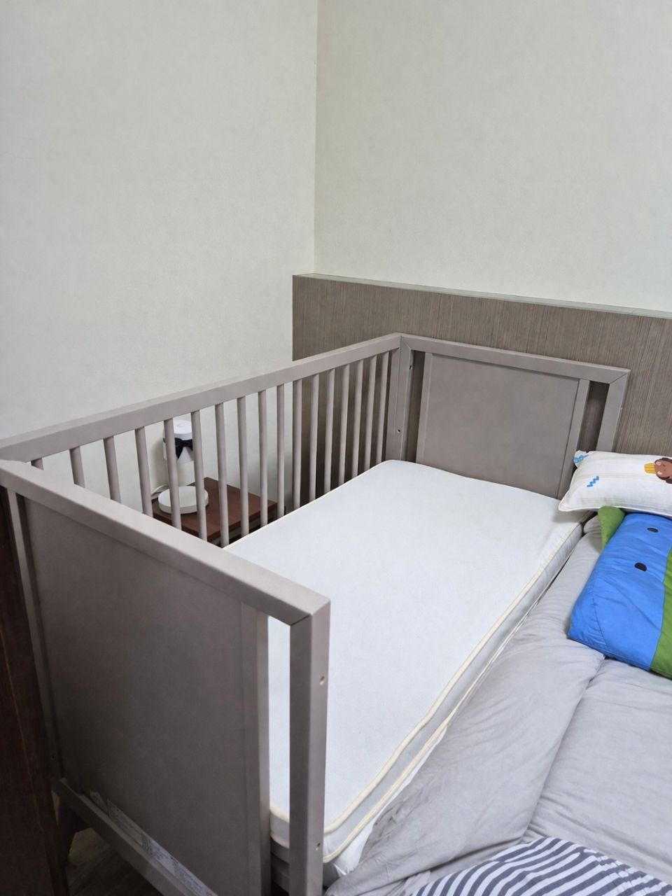 床很大可以使用很久,小孩不睡嬰兒床幾乎拿來放衣服,沒有炸屎跟尿床過,當初有訂製