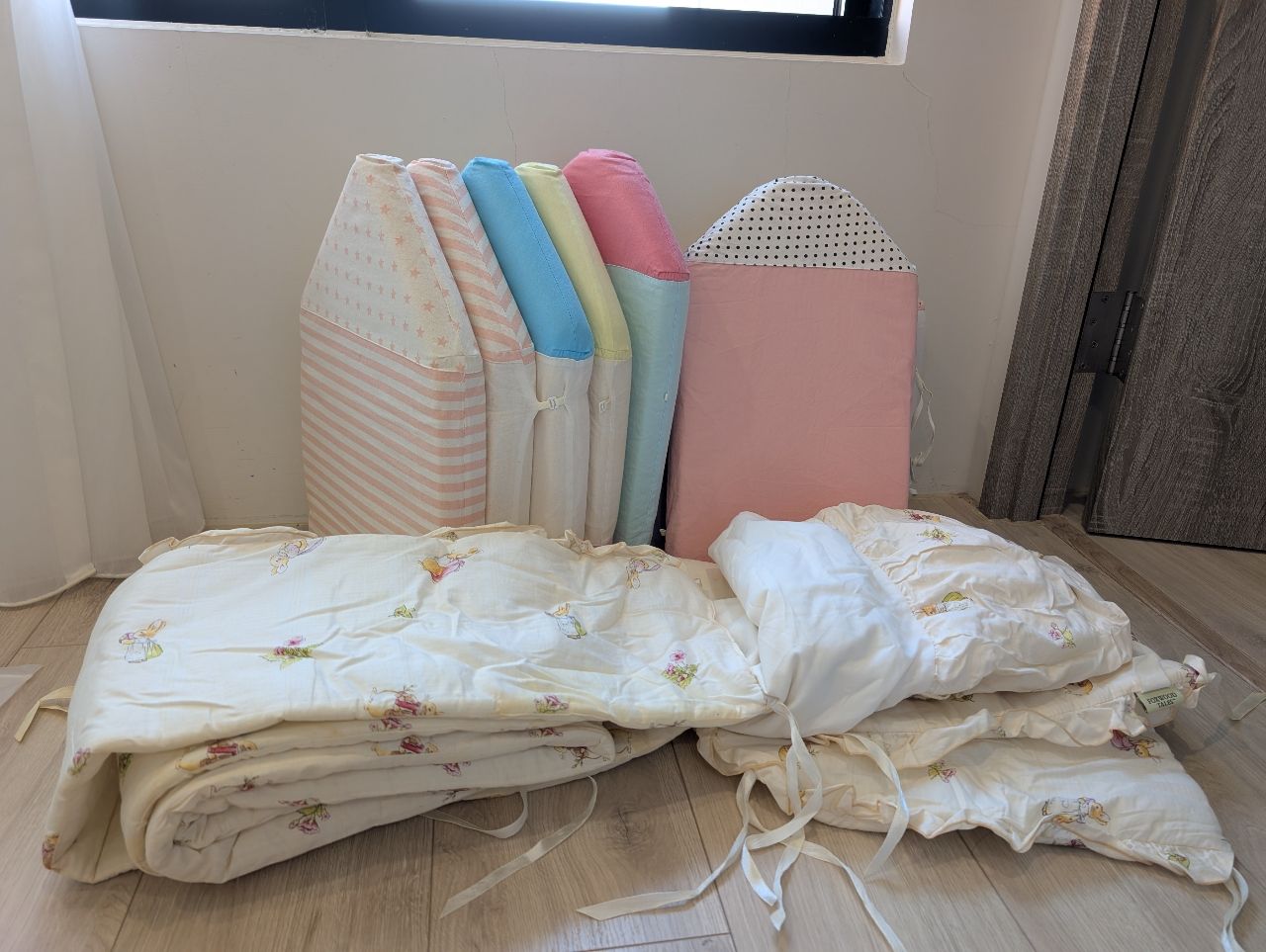 〔贈送〕照片中的嬰兒彼得兔跟小房子床圍,兩個床包,一個保潔墊。
