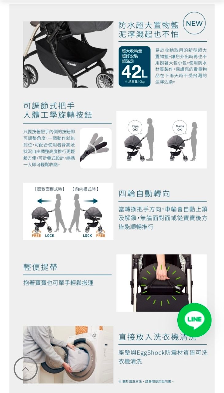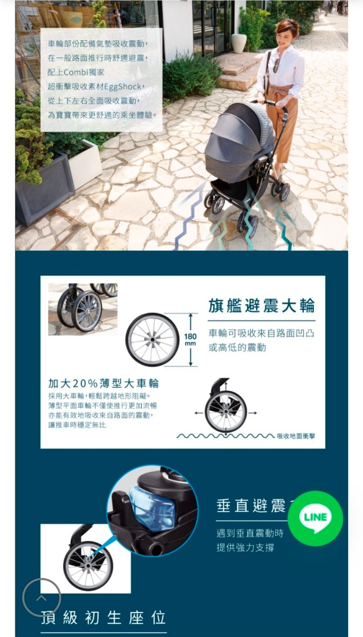 特色包括四輪自動轉向、180mm 大輪徑、EggShock 吸震座墊、抗UV及防潑水遮陽篷,適