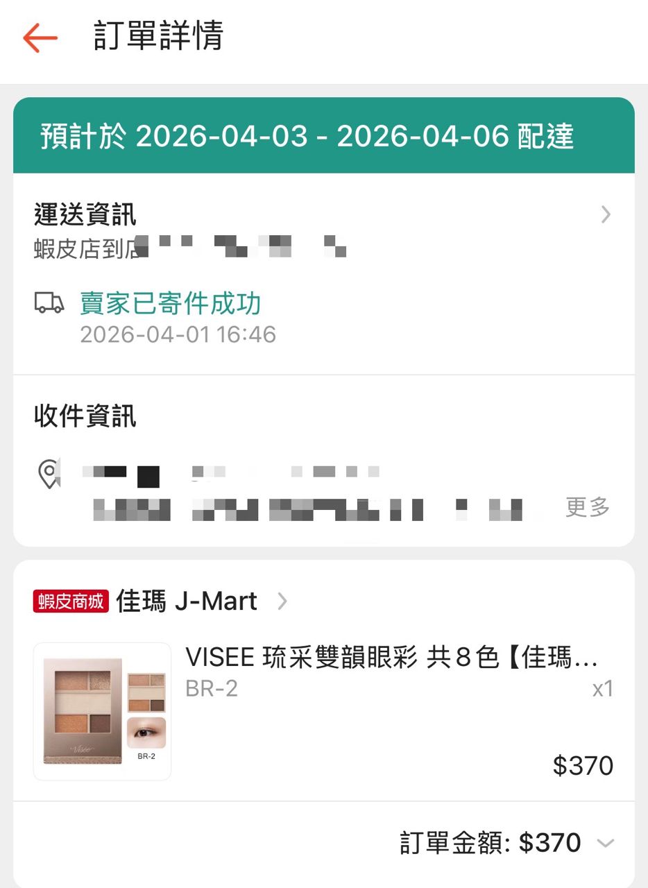 蝦皮(佳瑪)$370/購買日:2026/3/31/還未收到貨