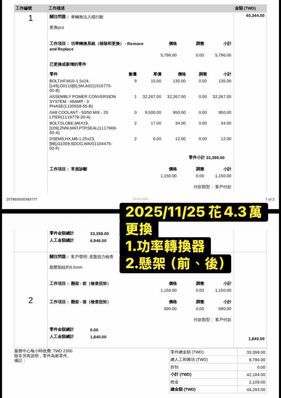 2025/11/25 花44293更換1.功率轉換器 2.懸架(前/後)