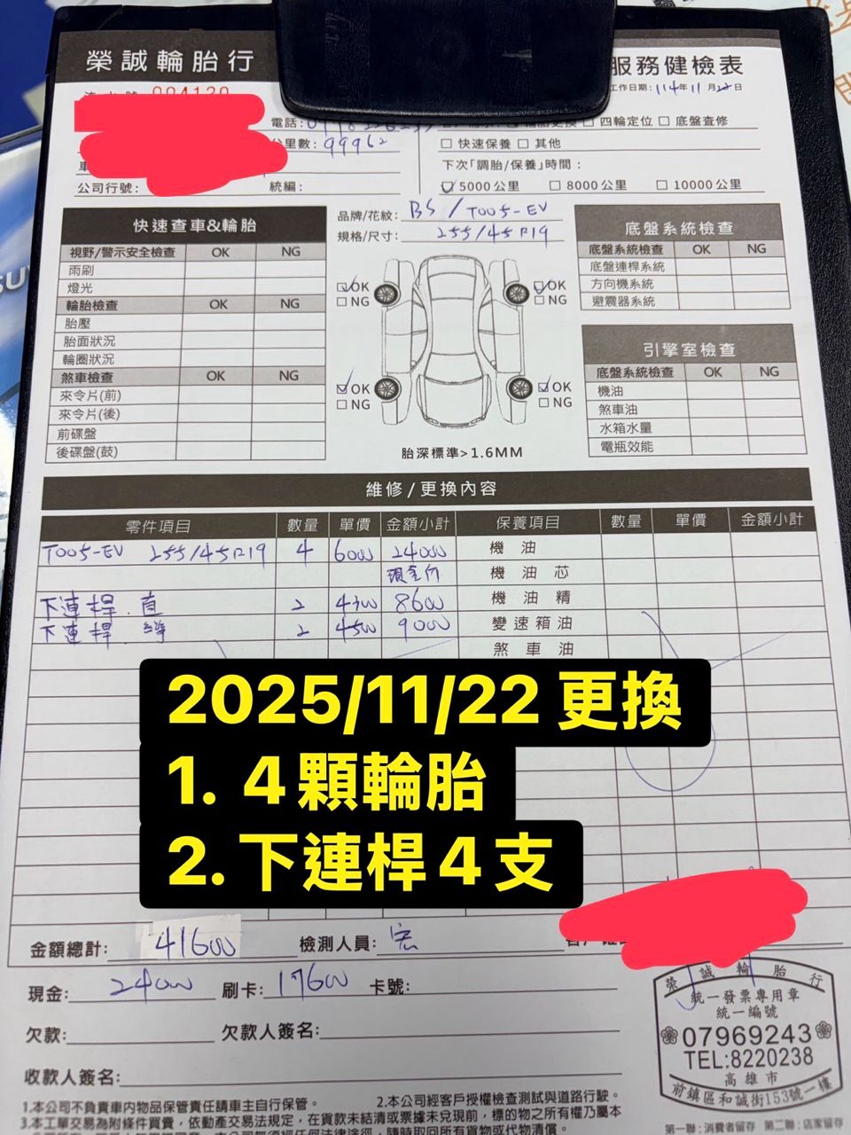 2025/11/22 花41600更換4顆全新輪胎+4支 下連桿