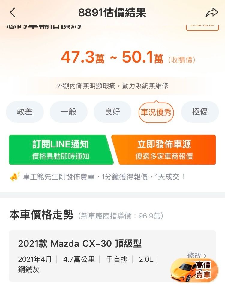 透過網路估價,可賣47-50萬,不知是否理想化了?
