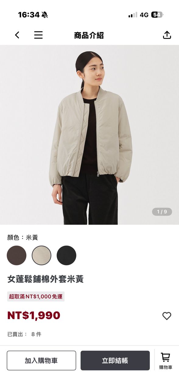 MUJI-女生蓬鬆鋪棉外套/米黃 M號 肩寬:47cm、衣長:59cm