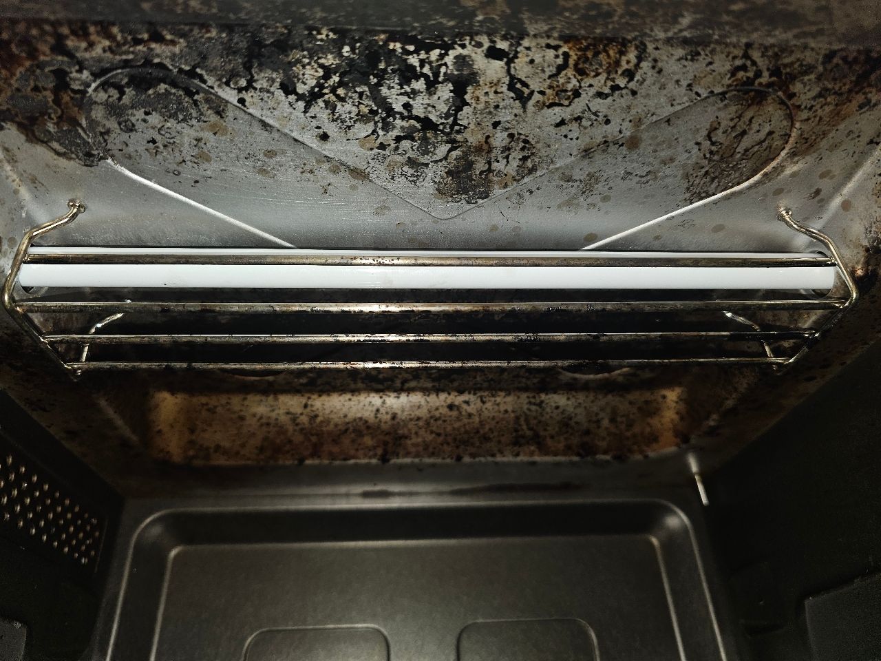 但上方的燒烤石英管只有鐵柵欄隔開,怕用燒烤模式油噴上去很難清
