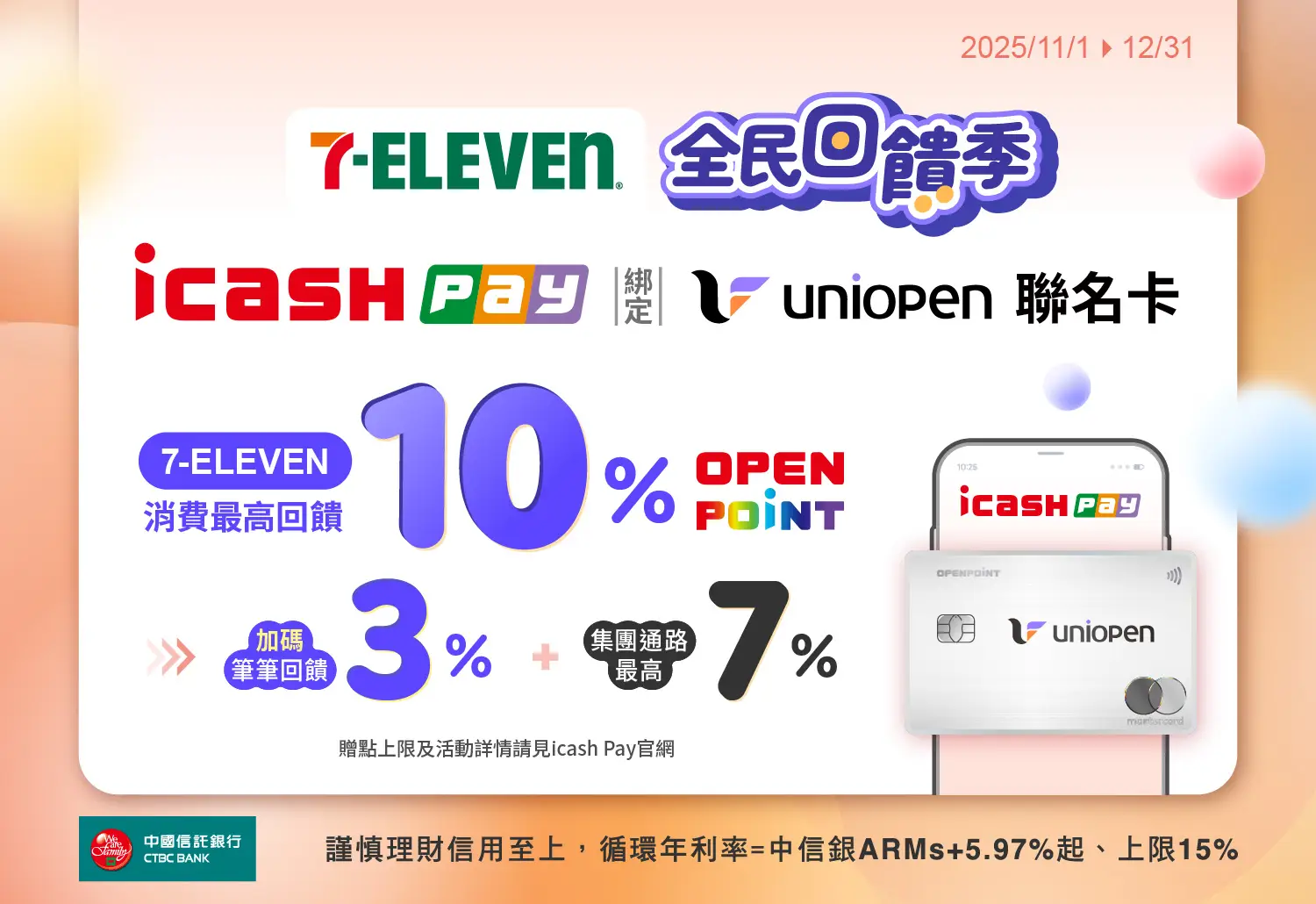 活動名稱:普發現金,全民回饋季!icash Pay綁定uniopen聯名卡 7-ELEVEN最高回饋10%