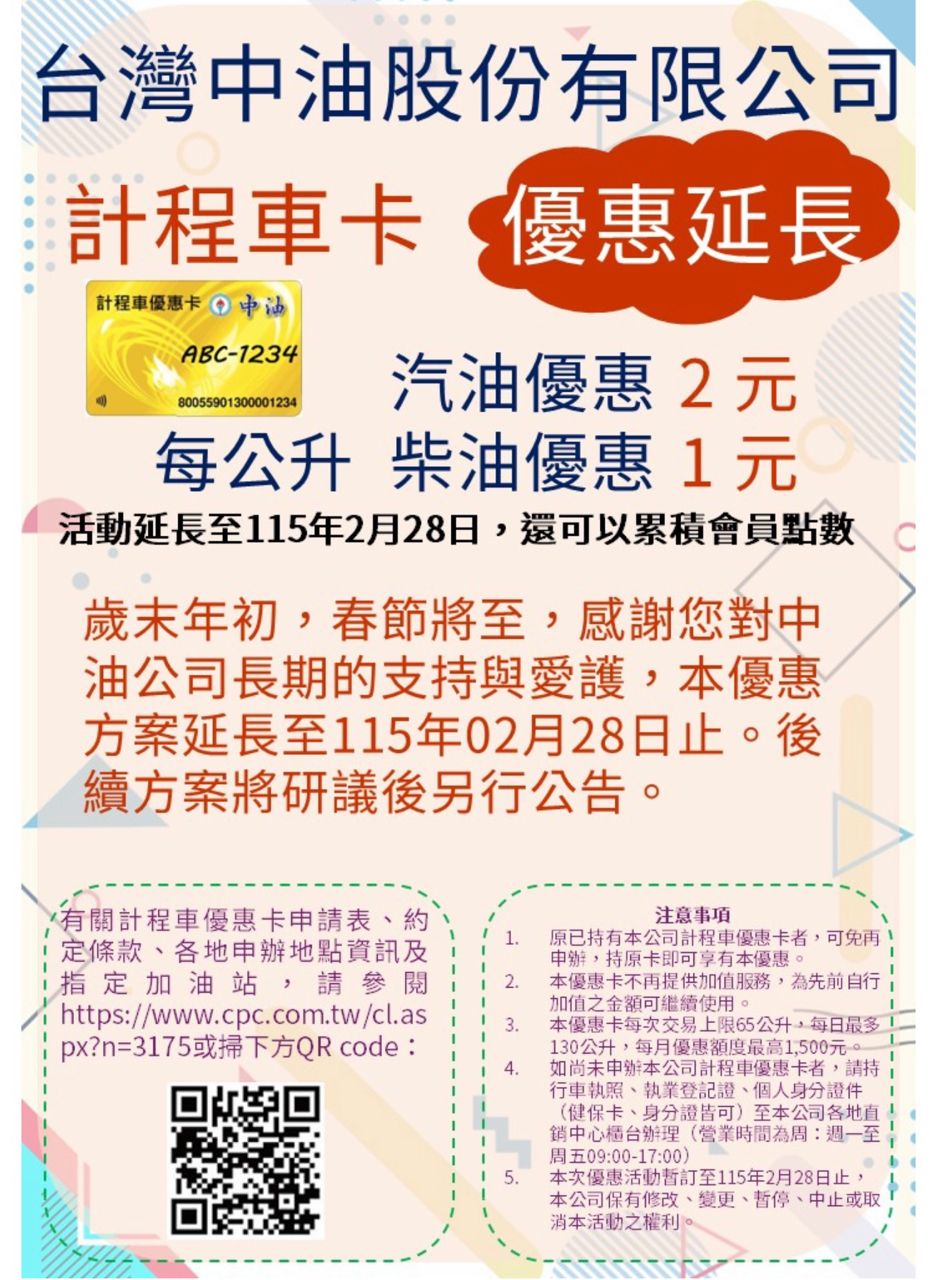 [情報] 計程車加油優惠延長至115/2/28