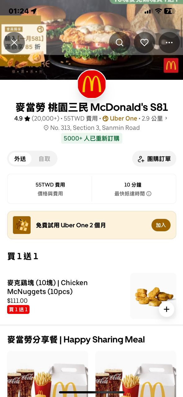 Ubereats 10塊買一送一 111元