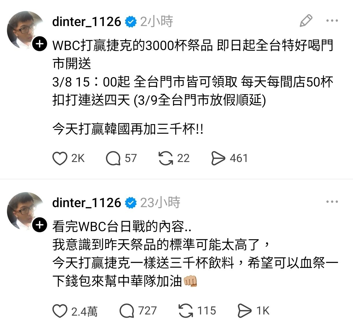 [情報] 中華隊大勝捷克 特好喝全國送3000杯