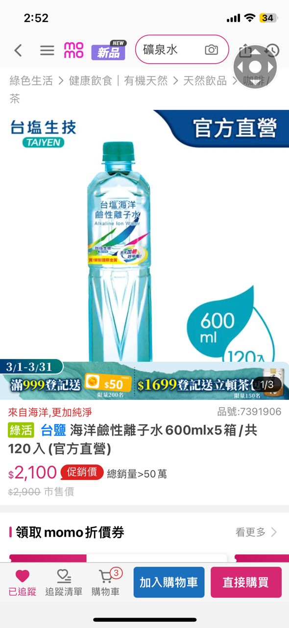 買了圖中的台鹽水1600元又使用了隨機贈送的20元mo 幣