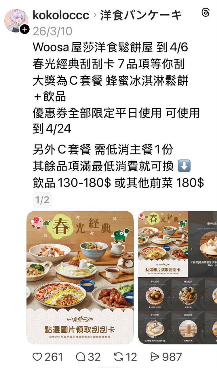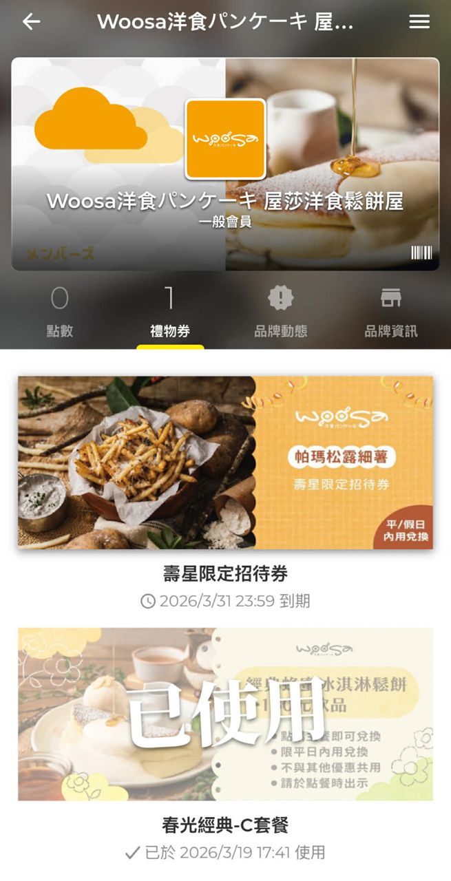 19.Woosa壽星送松露薯條但是我沒用我反而用了刮刮樂抽到的C餐點主餐送鬆餅跟飲料。
