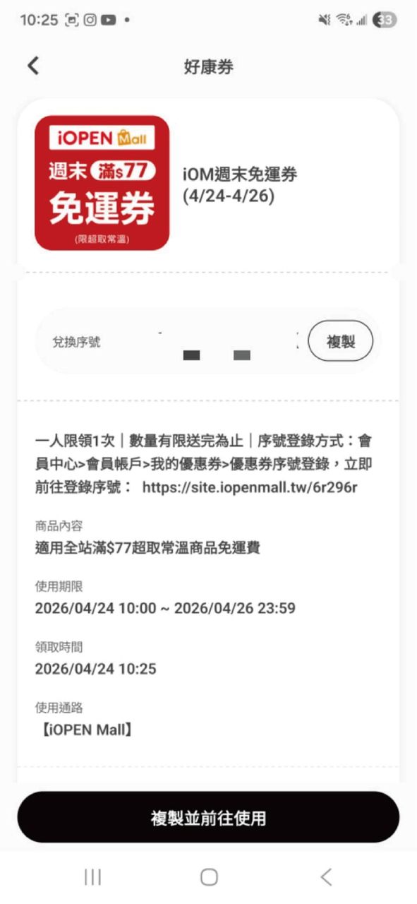 uniopen App 的好康券專區,領取 iOPEN Mall 全站免運券(限量),徹底解決運費煩
