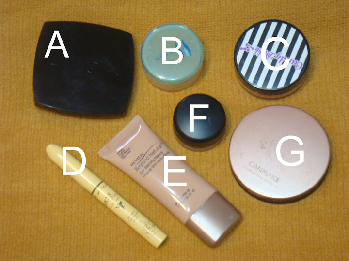 B:一灌鬆粉的礦務粉底(礦物粉底光澤都蠻自然的,真妙,不過不適合毛孔粗大的人)