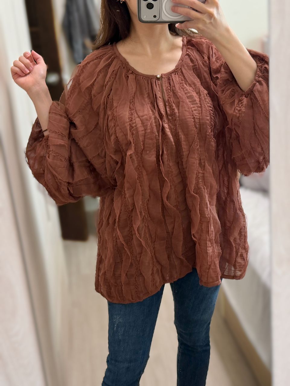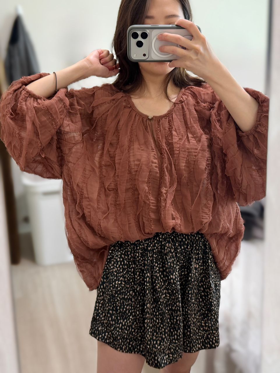 雪紡上衣比想像中的厚實一些,喜歡穿起來的份量感,搭配裙裝或褲裝都可以