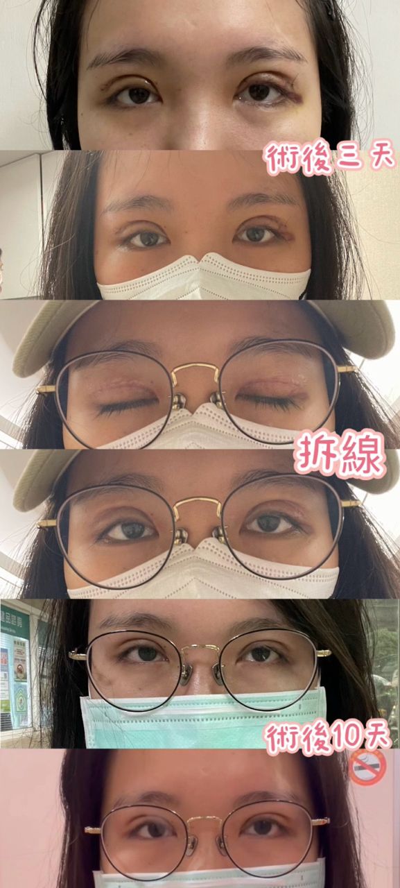 第七天就可以拆線了,瘀青大概14天才消掉,但是腫脹的眼皮,所以看起來會很怪,每天