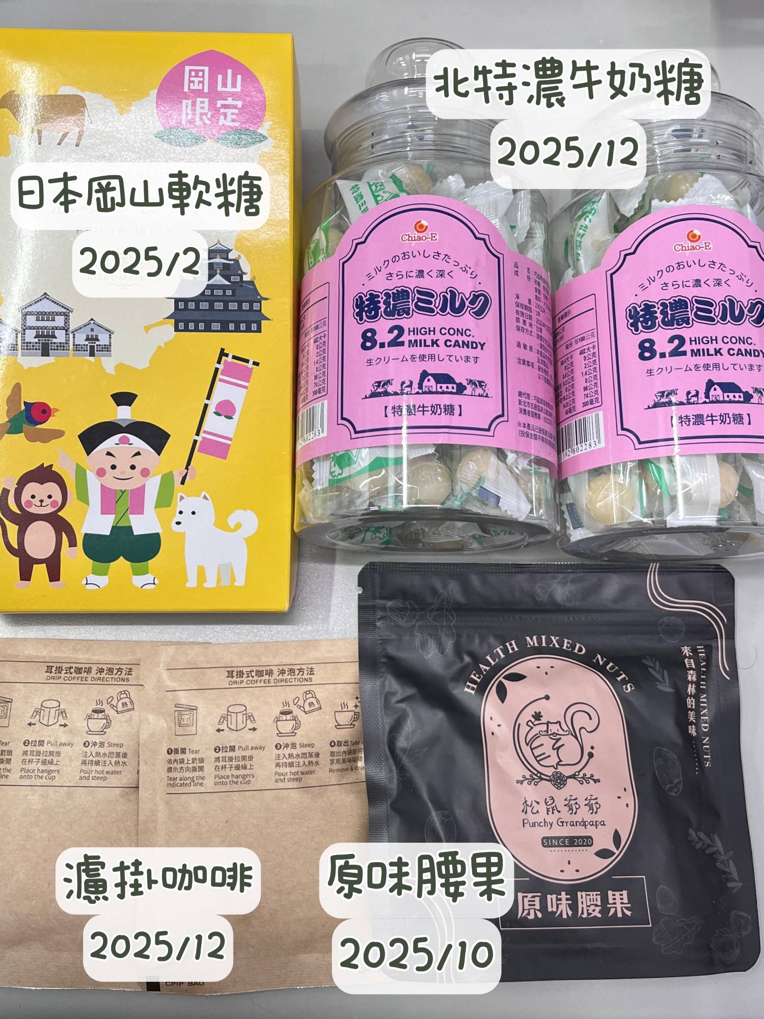 物 品:糖果/腰果/濾掛咖啡/泡麵