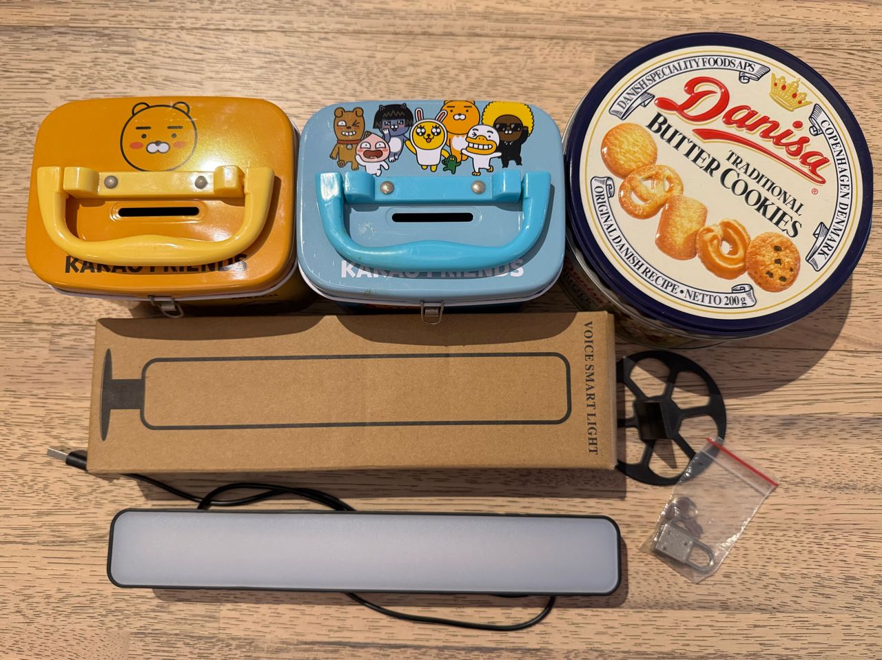 物 品:存錢收納鐵盒*2(但只有一個鎖),圓形空鐵盒、全新USB燈(無電池,需連