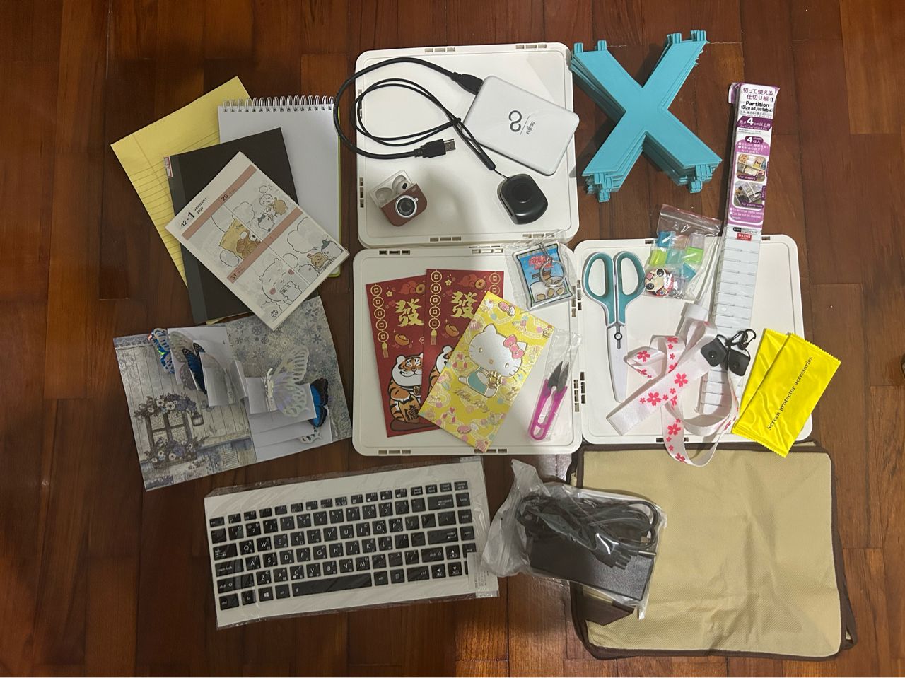 物)、防塵袋之前是裝DVD的、還有一些是被我當計算紙及便條紙的紙張、電源是筆電的