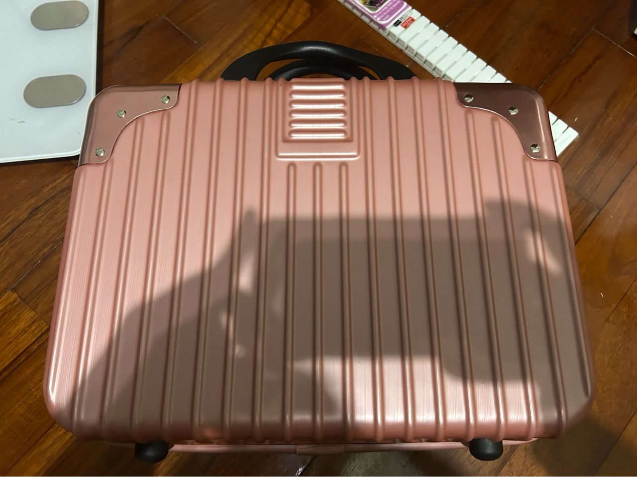 手提行李箱大概14吋左右、藍色叉叉那是跟白色板子可以組合成簡便鞋架(不能負擔太重