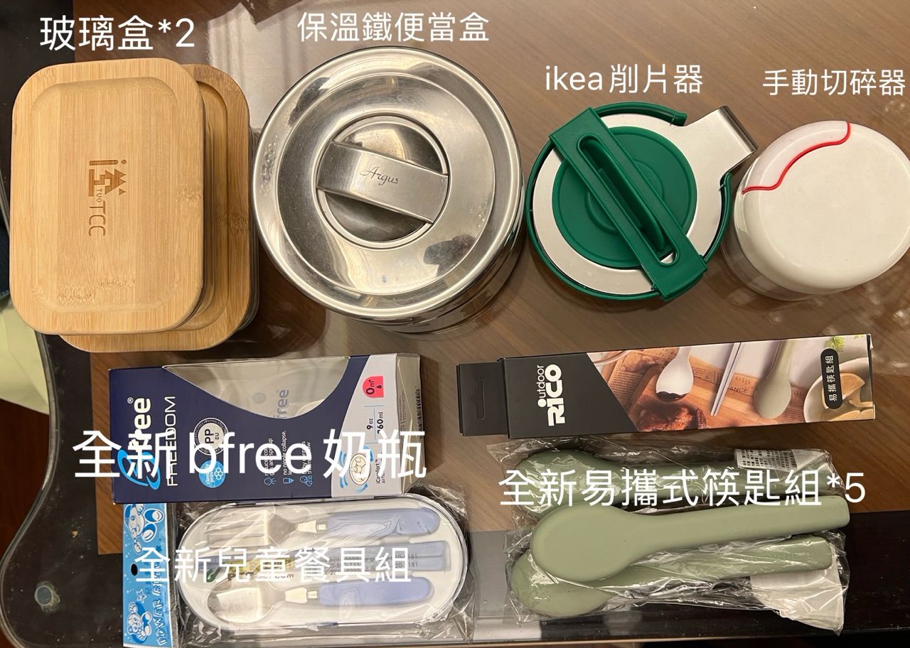 物 品:玻璃盒、保溫鐵便當盒、兒童餐具組、Bfree奶瓶、易攜式筷匙組、切片器、
