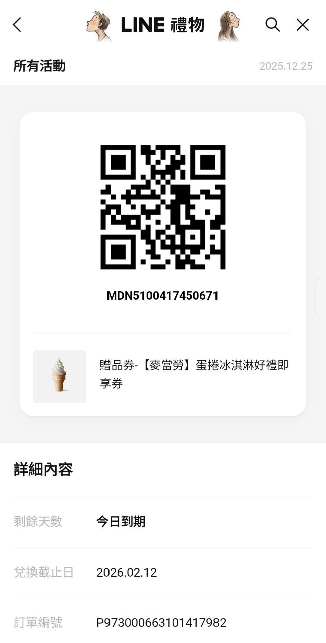 物 品:麥當勞蛋捲冰淇淋 兌換