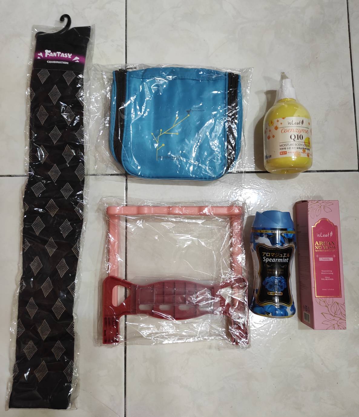 長襪、旅行收納包、浴室簡易毛巾掛架、乳液、香香豆、護髮等