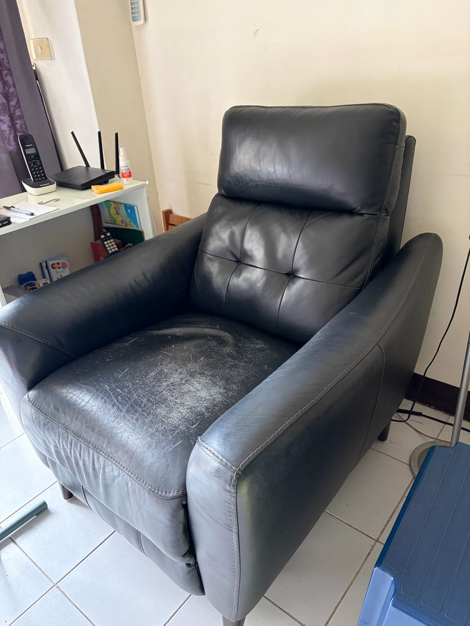 備 註:幾年前於Costco購入,椅面和背靠是牛皮,其餘是合成皮,椅面褪色,電動機