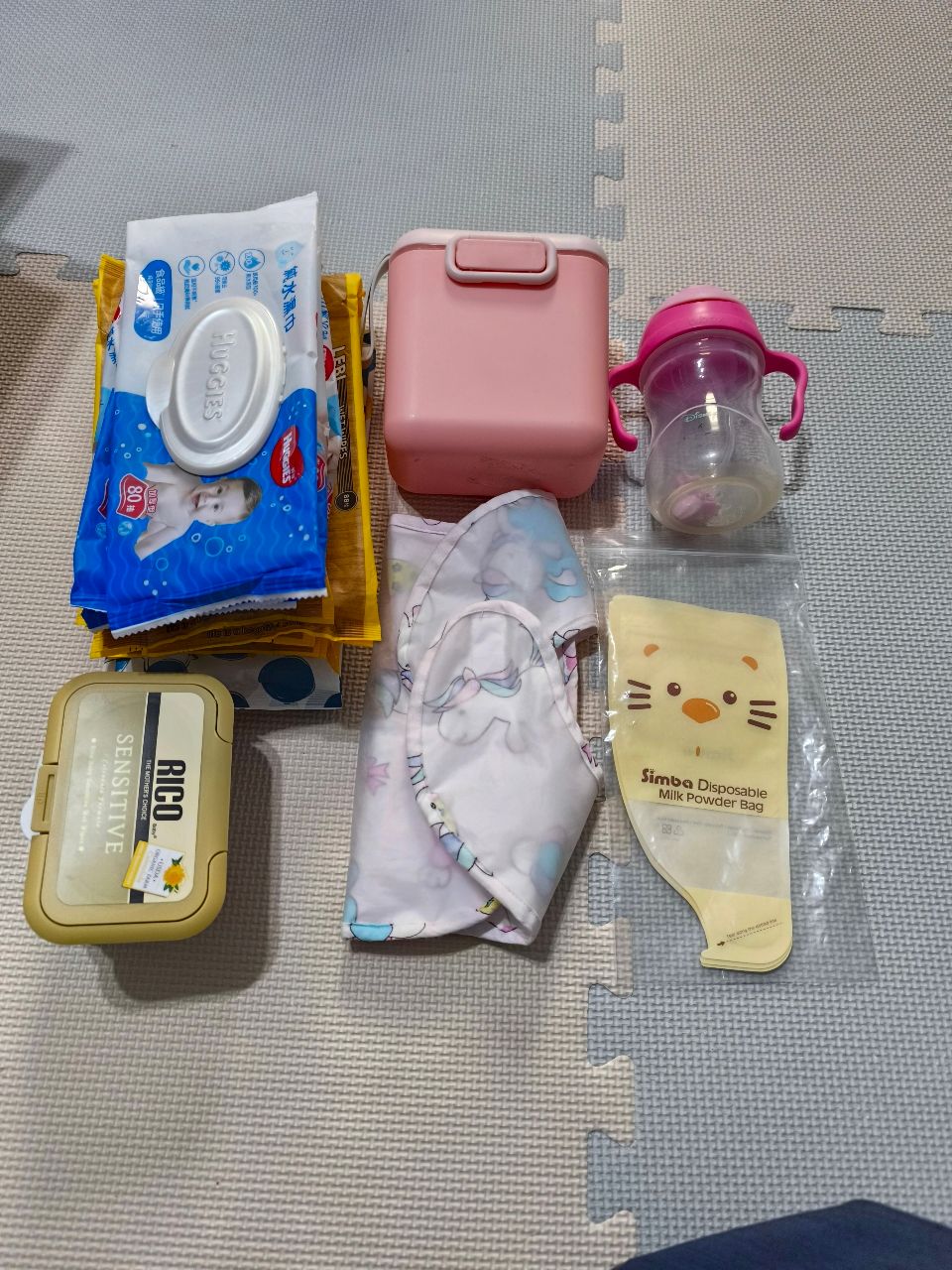 包括水壺一個,母乳袋,圍兜兜,攜帶式奶粉罐,濕紙巾蓋子約20個