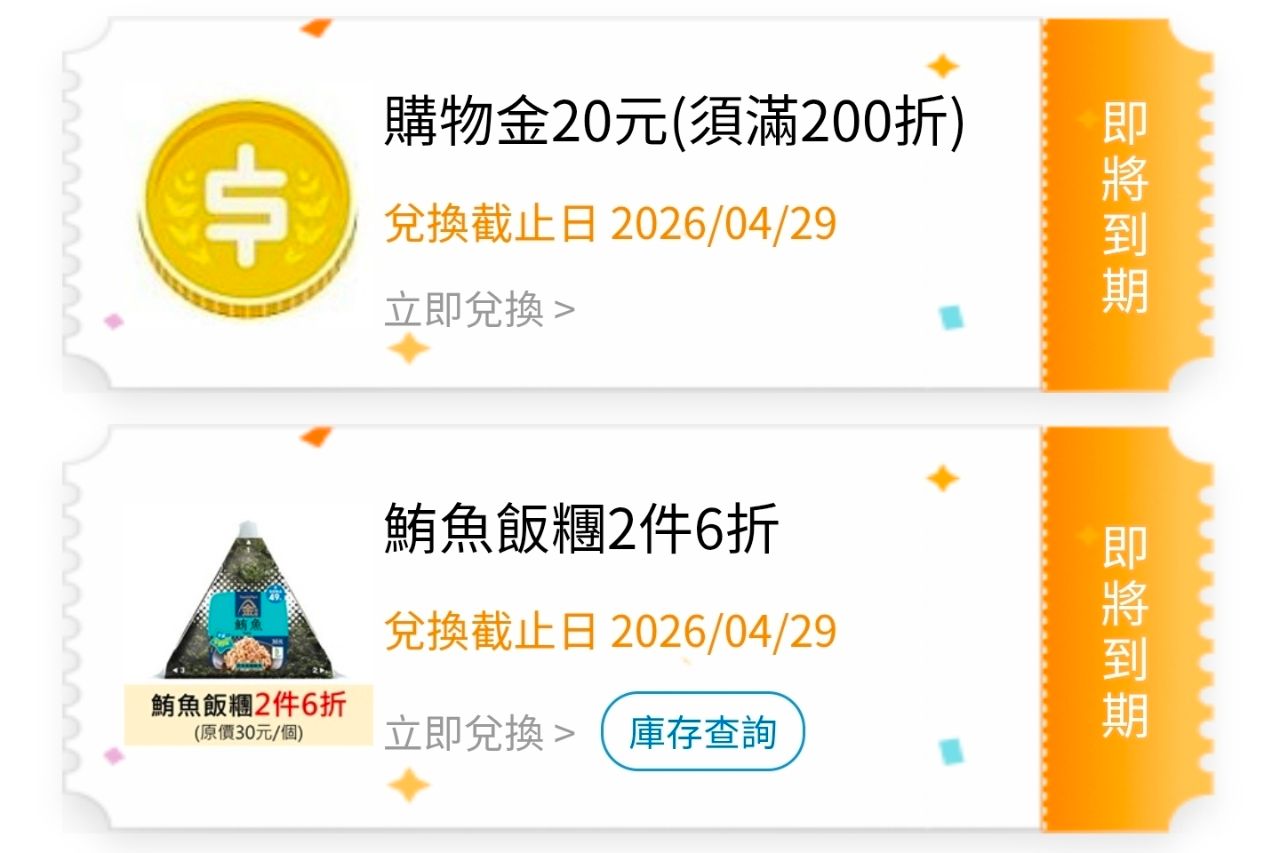 物 品:1、全家酷碰券200折20、2、鮪魚飯糰2件6折券