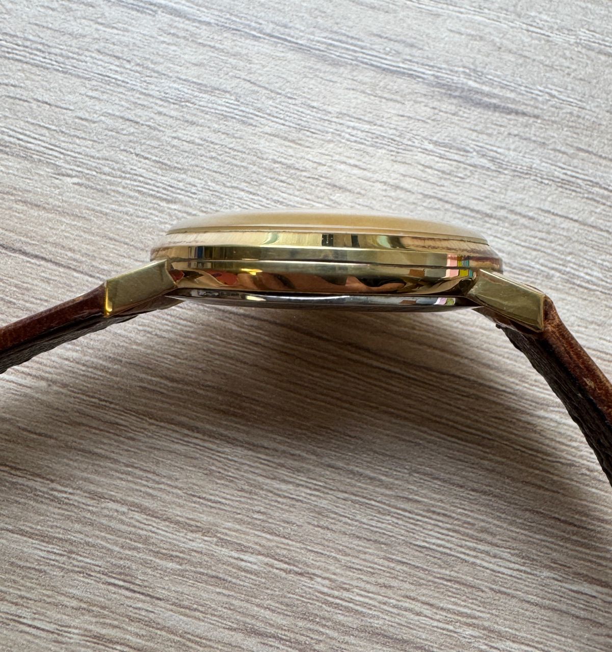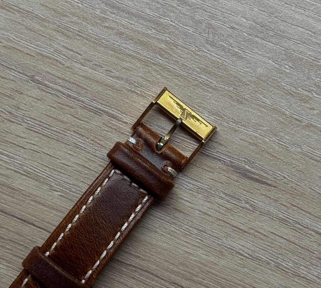 金色直紋面盤搭配6點鐘方向的大正製藥老鷹圖騰,外殼包金材質,用拭銀布擦拭會更亮