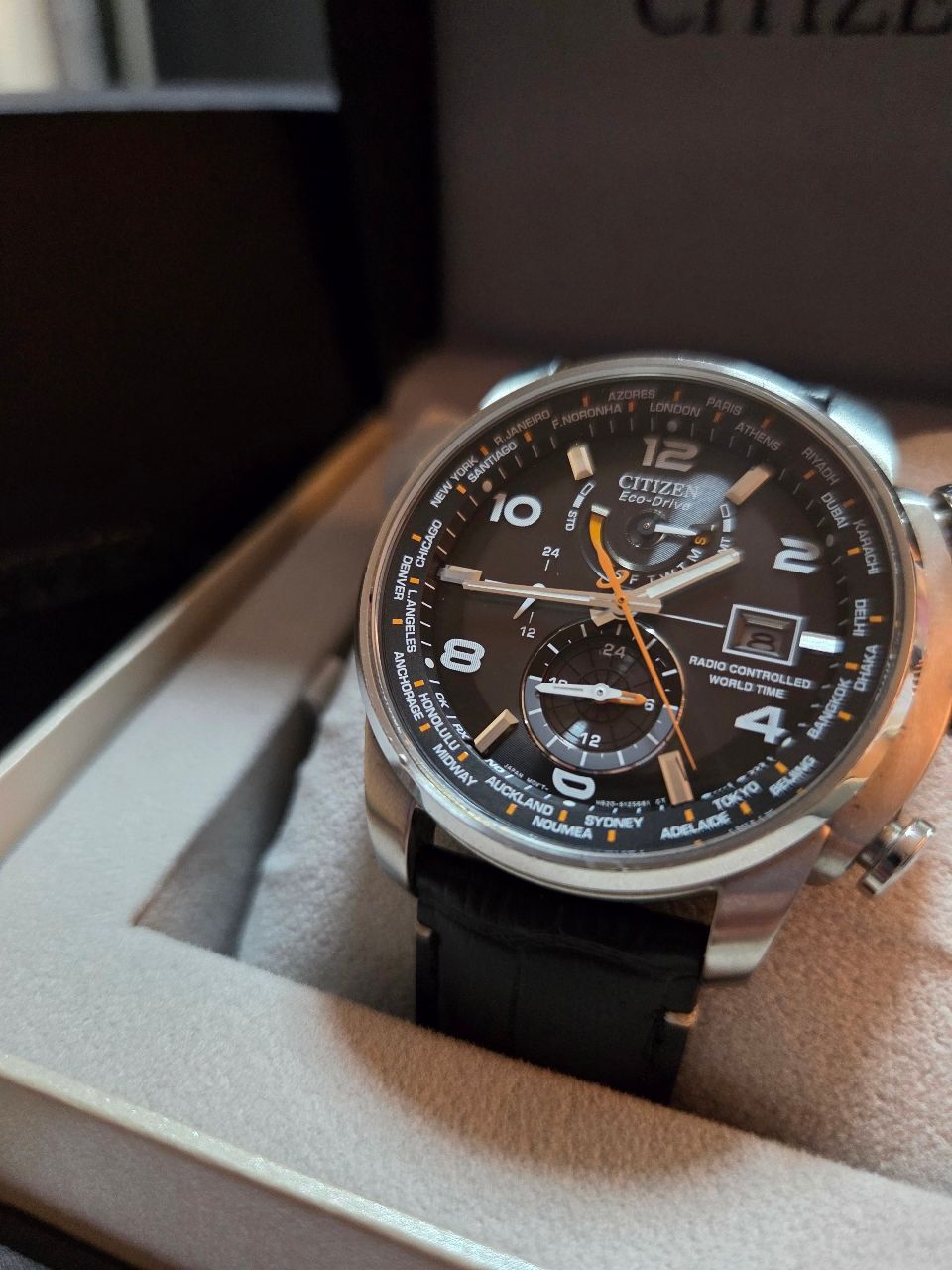 俗來支電波萬年曆吧!橘針仿賽車風格,這是日本限定皮帶款,非常適合冬天,在賽車與