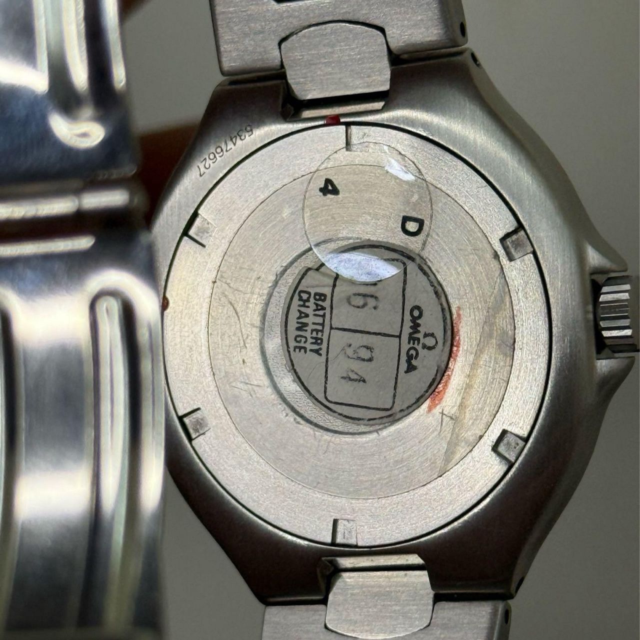 更換電池的背蓋貼紙也還在,且序號非常清楚,完整度非常高,購於日本的二手錶店。