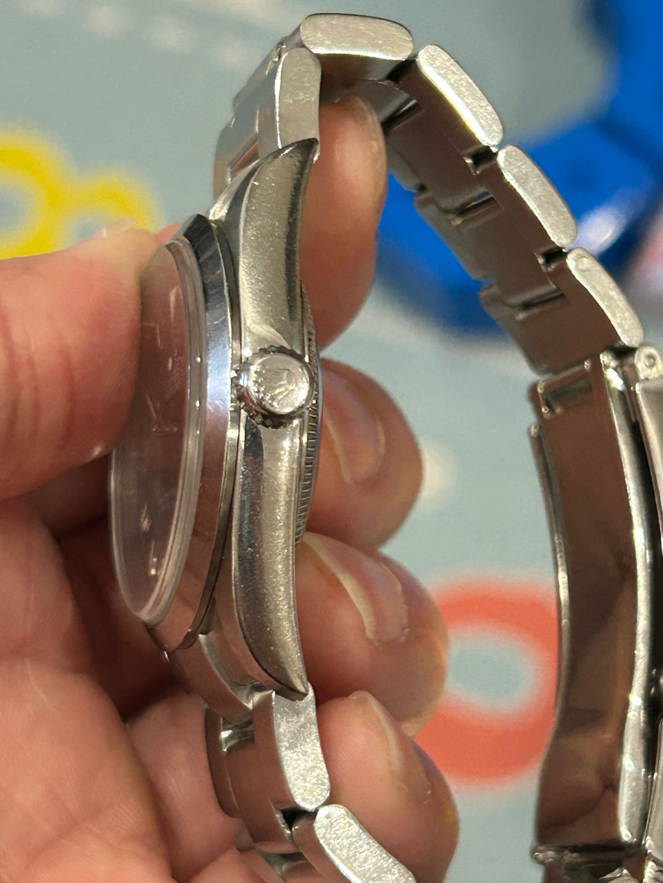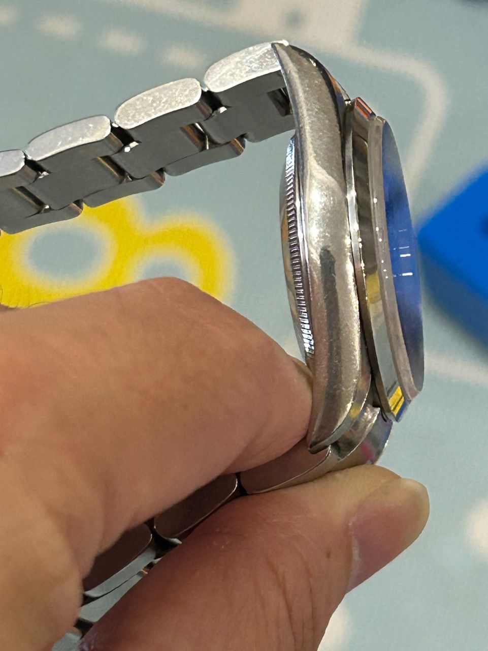 1. 殼形:約 85 成新。維持原裝俐落稜角,應該是無拋整過,錶耳厚度對稱飽滿,放射